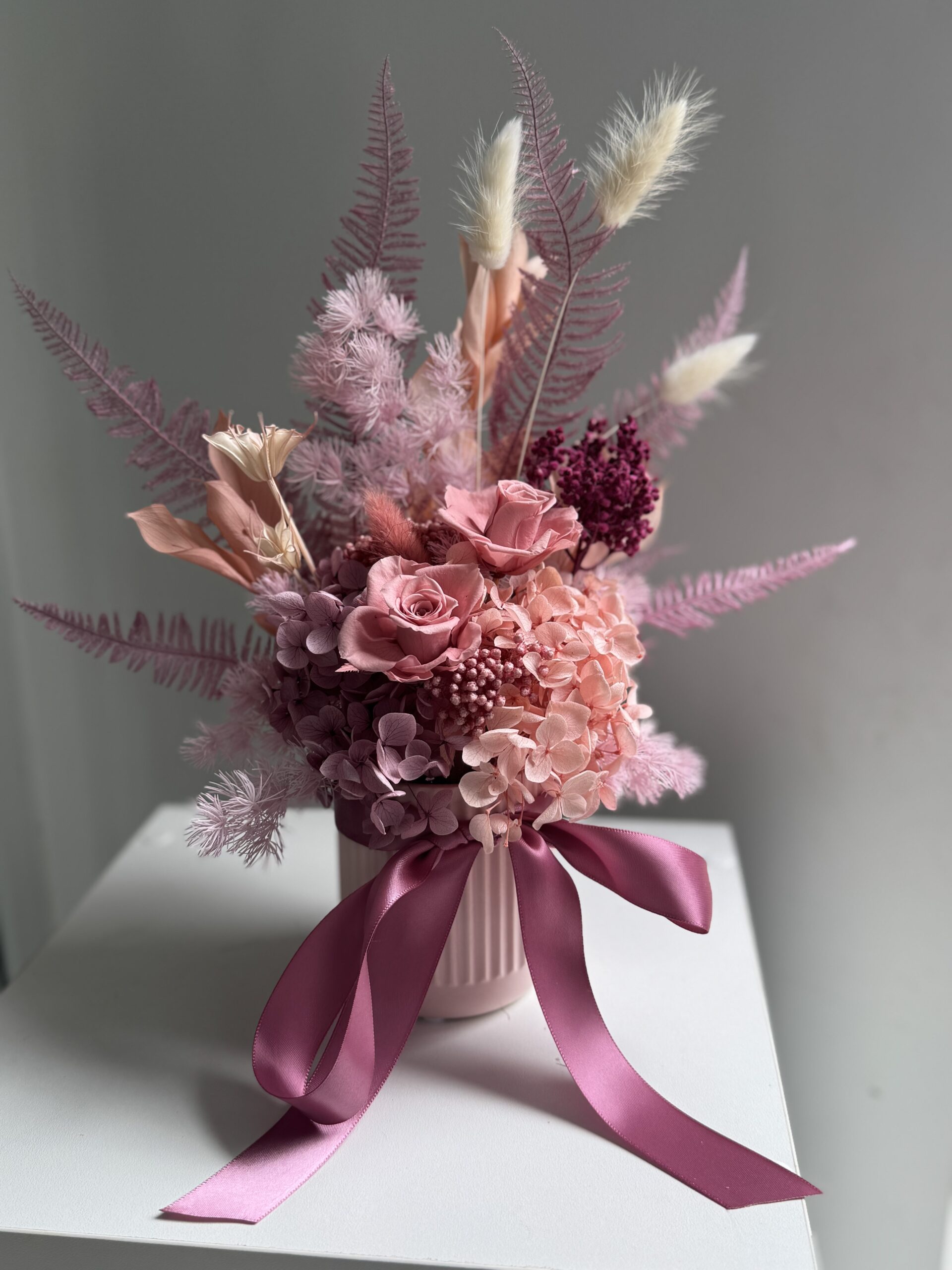 Shes mini but mighty, packed with preserved flowers, this arrangement will bring the joy & last years.